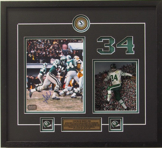 The autographed photo and Limited Edition action figure of George Reed in the Riders white on green retro uniforms comes professionally framed with shadowbox and laser-cut number 34, featuring 3 Riders Collector Coins.