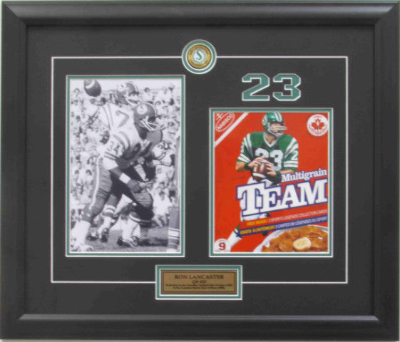 This piece comes professionally framed with dual photos of Ron Lancaster, laser-graved #23, collector pin and descriptive plaque.